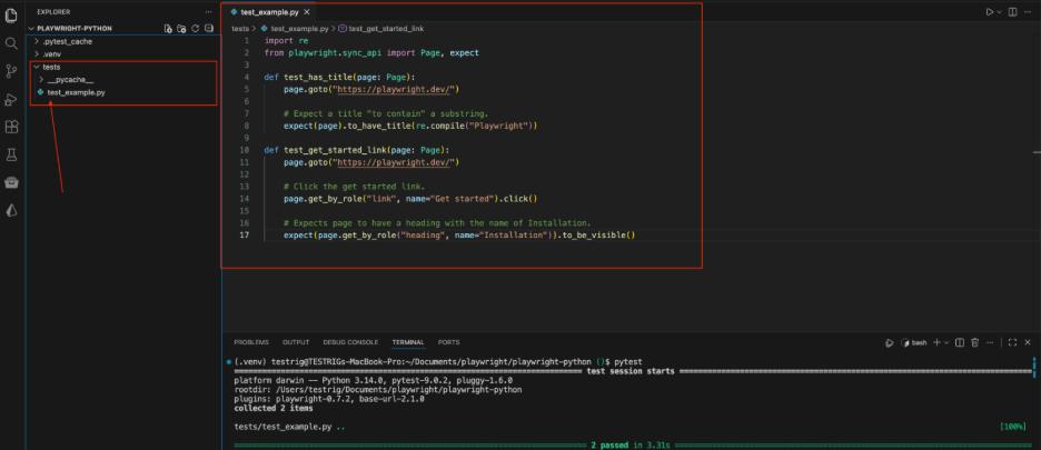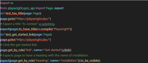 Add the following code to test_example.py. This script visits the Playwright homepage and verifies the title and a link: