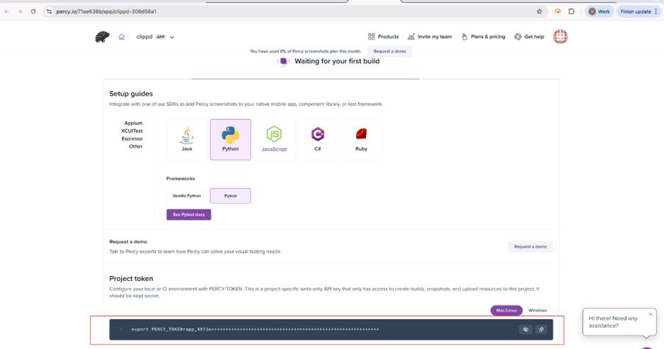 3. Copy the generated PERCY_TOKEN, which will be used to authenticate test executions with Percy.