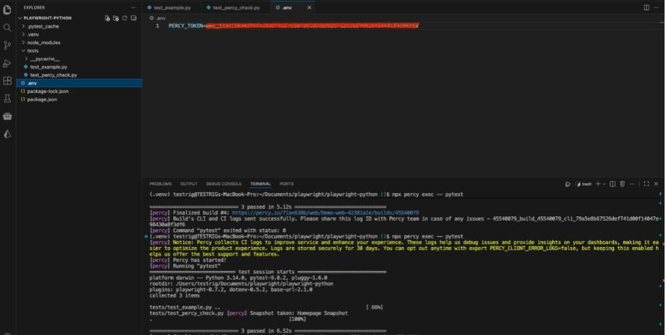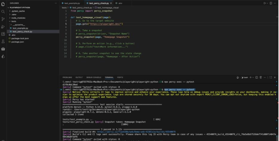 This is the critical step. Running the tests requires more than just pytest; the command must be wrapped with percy exec.