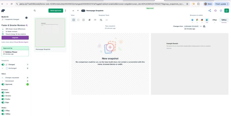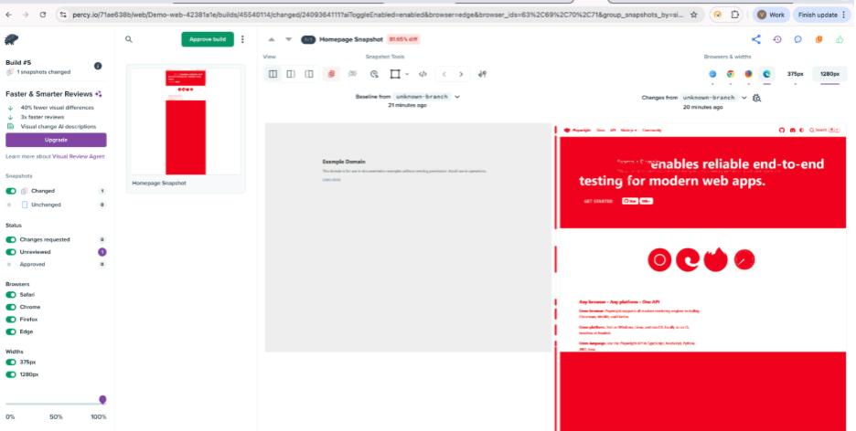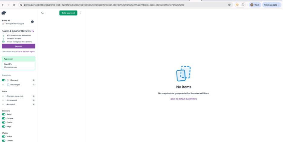 By integrating Playwright’s reliable automation with Percy’s visual testing capabilities, testing goes beyond simply verifying that a feature works. It now ensures that the application appears exactly as intended by the design team.