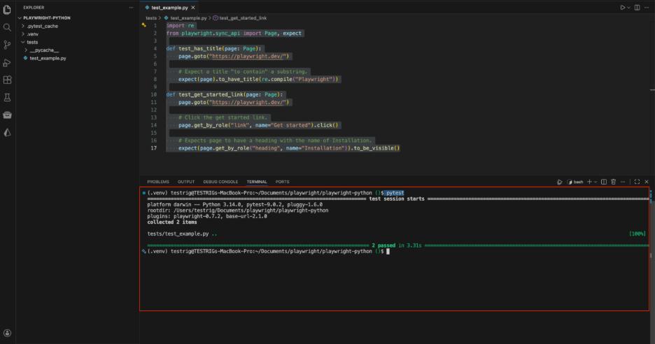 Add the following code to test_example.py. This script visits the Playwright homepage and verifies the title and a link: